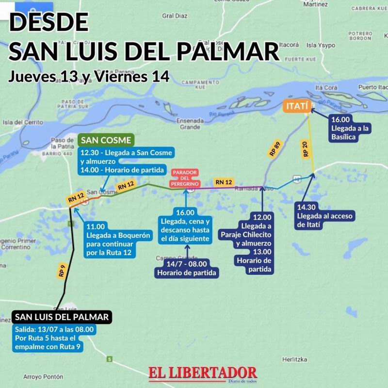 Además, para el dispositivo se tuvo en cuenta la movilización de quienes se unen desde Mburucuyá, Santa Rosa, Itá Ibaté, los jinetes de Caá Catí y los ciclistas que varios días antes parten desde Caseros, así como los que salen desde Posadas, Misiones, y las congregaciones de otras provincias que llegan para esta fecha.
