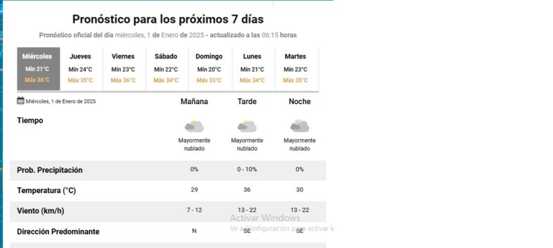 De acuerdo con el Servicio Meteorológico Nacional la jornada de este 1 de enero será calurosa, mayormente nublado, con una temperatura máxima de 36°C, que se daría en horas de la siesta.