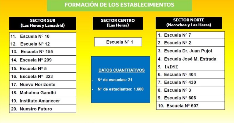 Las escuelas se organizarán en tres sectores: Sector Norte (Necochea y Las Heras. Sector Centro (Las Heras): Escuela N° 1. Sector Sur (Las Heras y Lamadrid).
