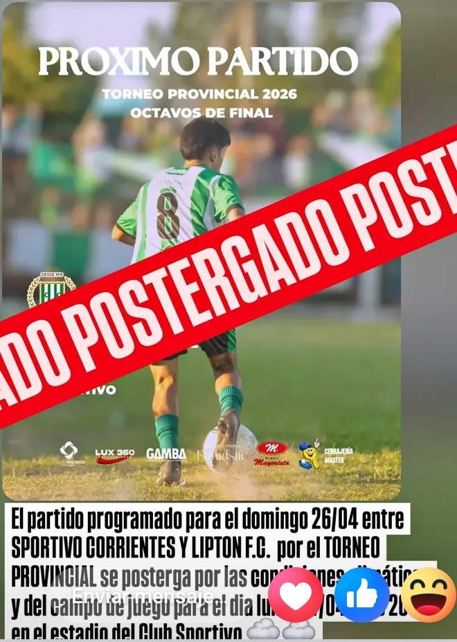 Los dirigentes de Sportivo Corrientes junto con sus pares de Lipton decidieron la suspensión del juego de ida de una de las llaves de octavos de final del Provincial de Clubes que organiza la Federación Correntina de Fútbol.