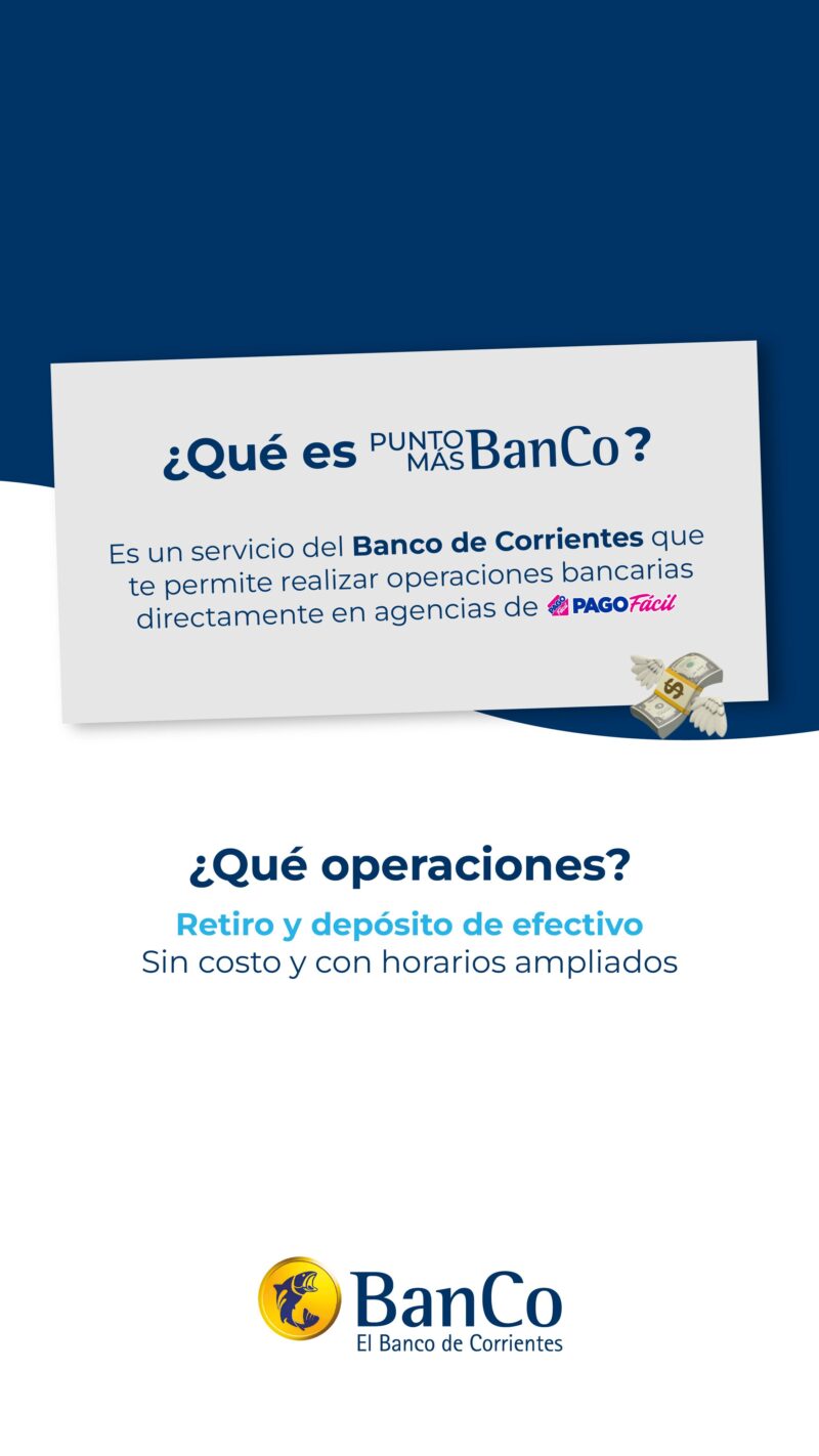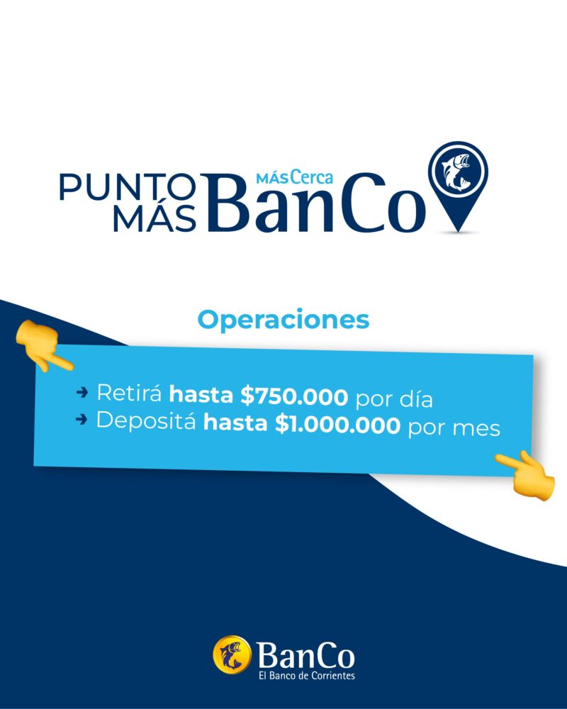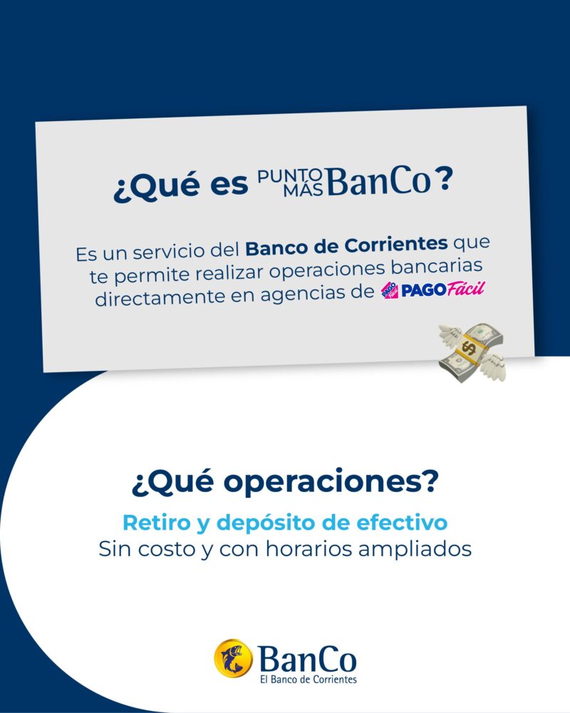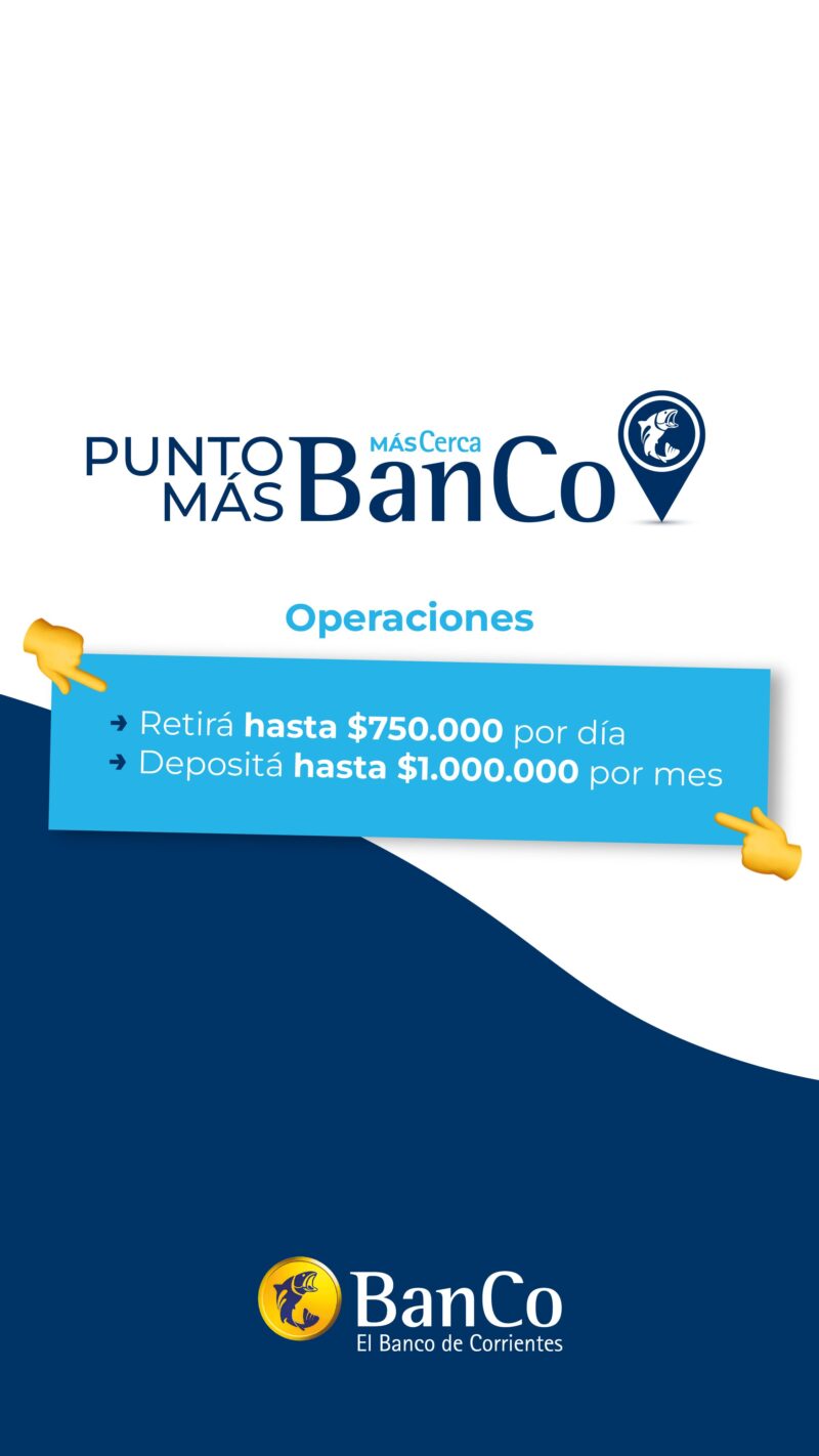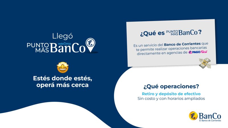 Con el objetivo de ofrecer mayores alternativas al momento de realizar operaciones bancarias esenciales, el Banco de Corrientes (BanCo) presenta Punto MÁSBanCo, un nuevo servicio que permite a sus clientes realizar extracciones de hasta $750.000 por día y depósitos de hasta $1.000.000 por mes directamente en los locales de Pago Fácil distribuidas en todo el territorio nacional.