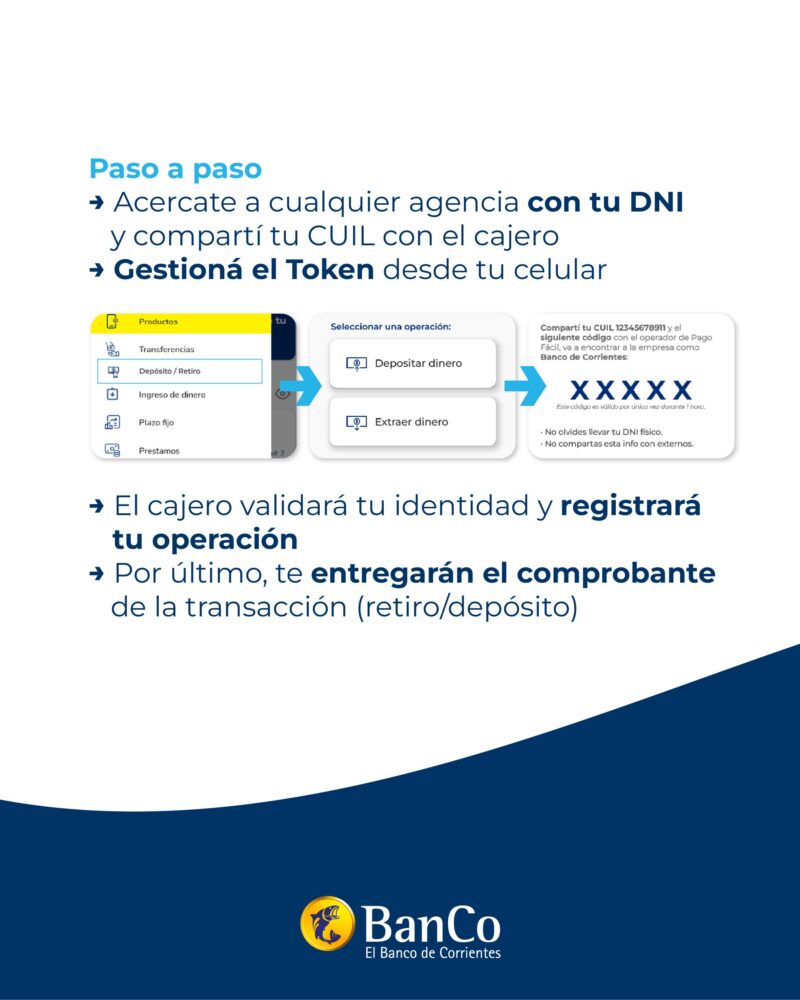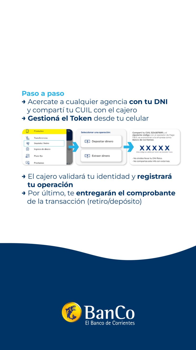 Para operar, el cliente debe acercarse a una agencia de Pago Fácil con su DNI, informar su número de CUIL y el monto a retirar o depositar, y generar el token (código de seguridad) desde la aplicación MÁSBanCo. El cajero validará la identidad, registrará la operación y entregará el comprobante correspondiente.