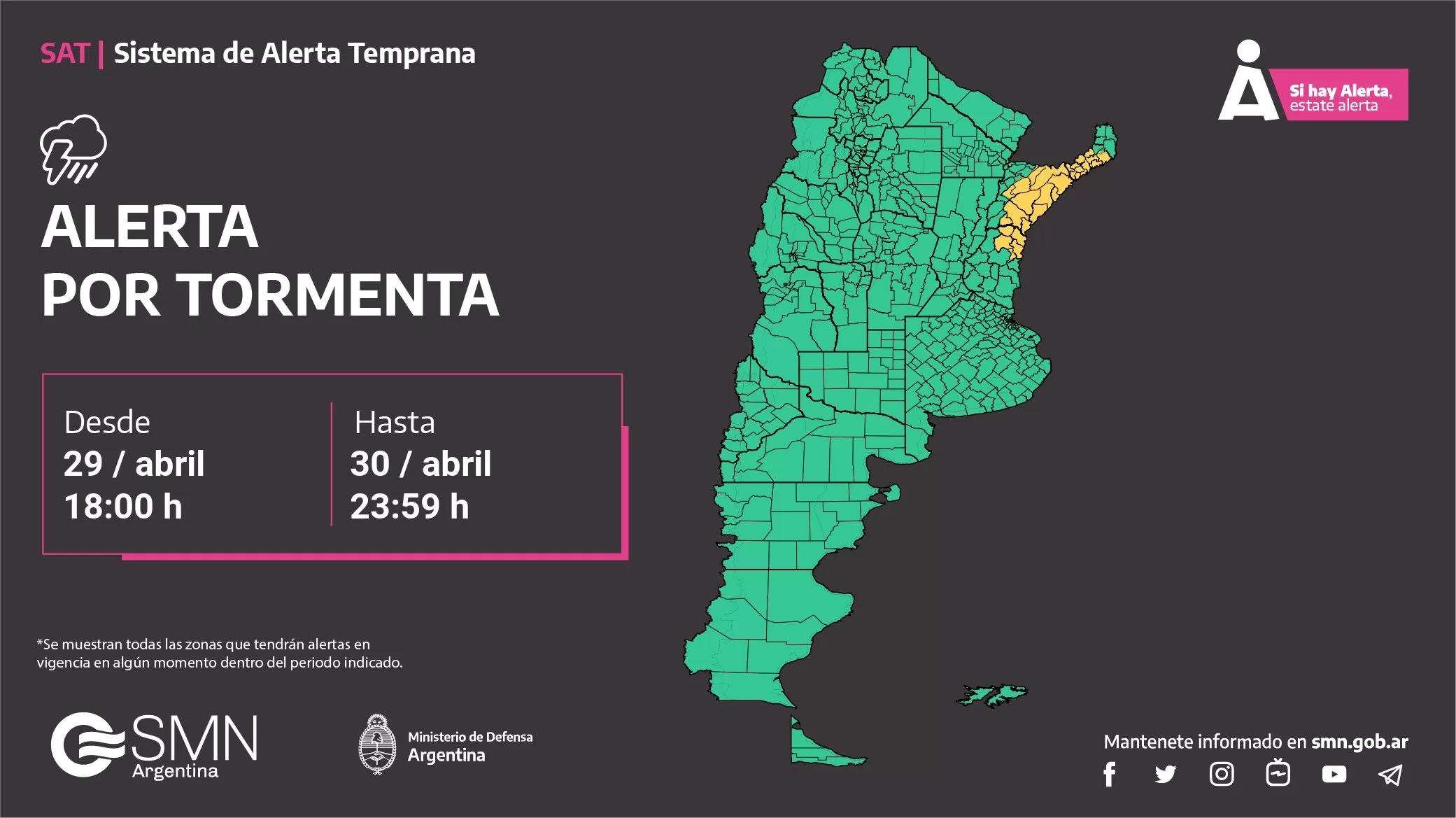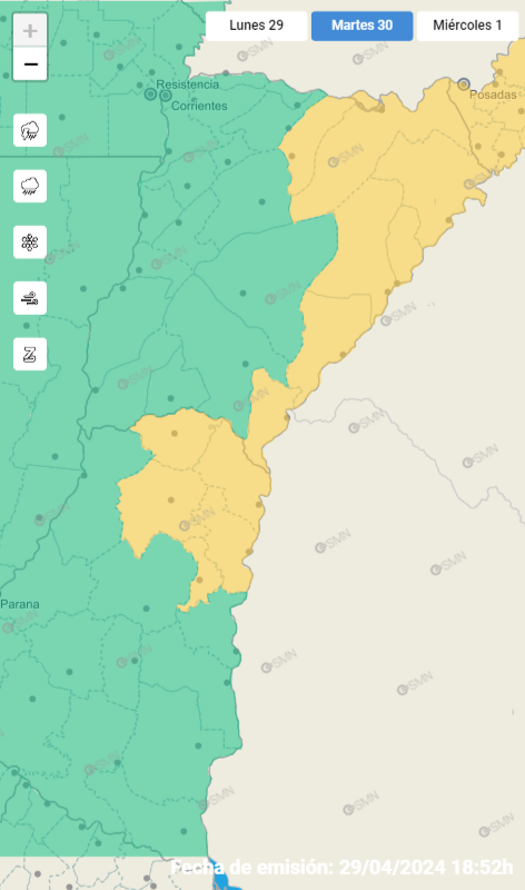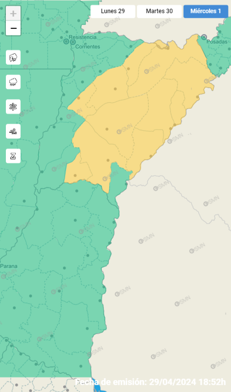 El Servicio Metereológico Nacional informó que rige alerta amarilla para para Concepción, Curuzú Cuatiá, General Alvear, Ituzaingó, Mercedes, Paso de los Libres, San Martín, San Miguel, San Roque, Santo Tomé, Sauce.