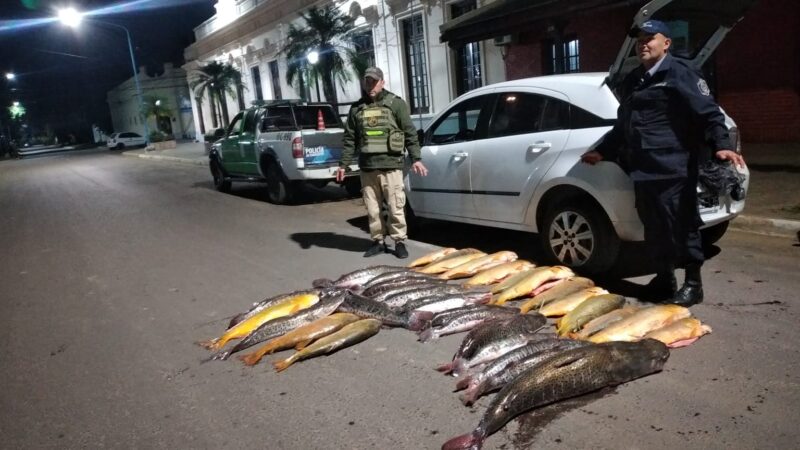 Dos hombres, uno de 34 y el otro de 51 años, quedaron demoraron anoche tras intentar pasar por el control policial de la Ruta Nacional Nº12, en el acceso a San Cosme, con el auto repleto de ejemplares de dorados y surubíes.