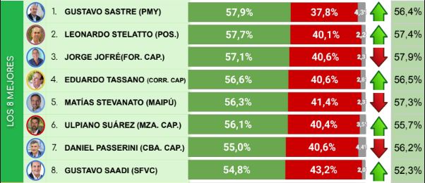 Por otro lado, en el caso de los principales intendentes del país, Eduardo Tassano se ubicó en el puesto 4 de entre los mandatarios considerados, con 56,6 por ciento de imagen positiva y 40,6 por ciento de imagen negativa.