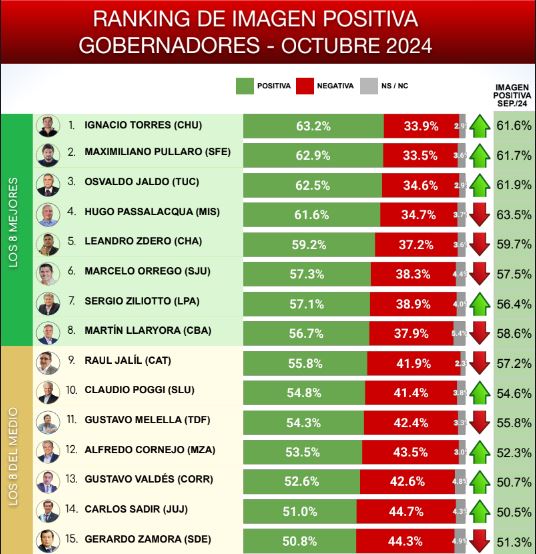 De acuerdo a la encuestadora, el gobernador Gustavo Valdés se encuentra en el puesto 13 de los mandatarios provinciales con mejor imagen. Más allá de su puesto, cabe destacar que fue el que más creció en su apreciación, subiendo un 1,9 por ciento respecto a su valoración de septiembre.
