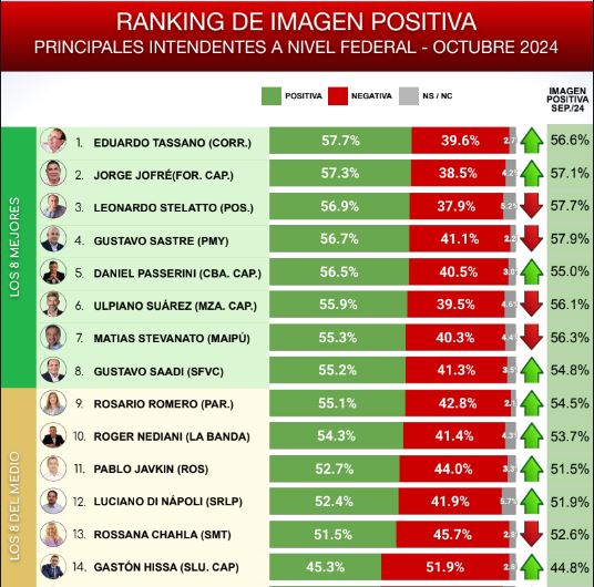 Por su parte, el intendente Eduardo Tassano fue el jefe comunal de mejor imagen del país, con un 57,7 por ciento de aprobación.