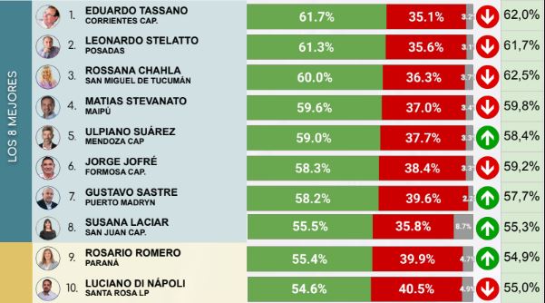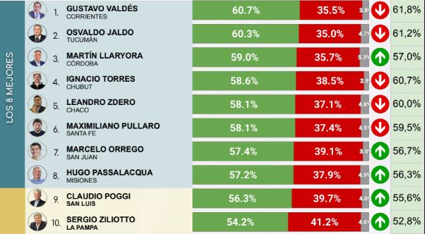 De acuerdo a la encuesta de la consultora, el gobernador Gustavo Valdés se quedó en el primer puesto de los gobernadores con mejor imagen positiva, con un 60,7 por ciento de imagen positiva y 35,5 por ciento de imagen negativa. Superó a sus pares de Tucumán, Osvaldo Jaldo, y Córdoba, Martín Llaryora.