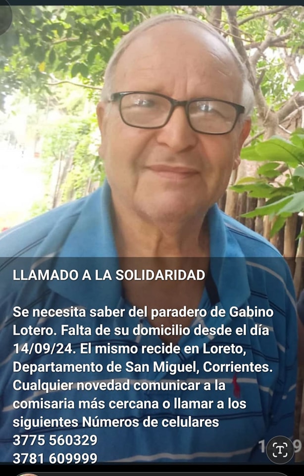 Gabino Lotero tiene 79 años y su familia no sabe nada de él desde el sábado pasado, cuando salió de su casa de la localidad de Loreto hacia una zona conocida como Los Bastidores. La Policía despliega un mega operativo de búsqueda que incluye rastrillajes en montes, lagunas y esteros con caballos, a pie y con drones, pero hasta ahora, el paradero del hombre es un completo misterio.
