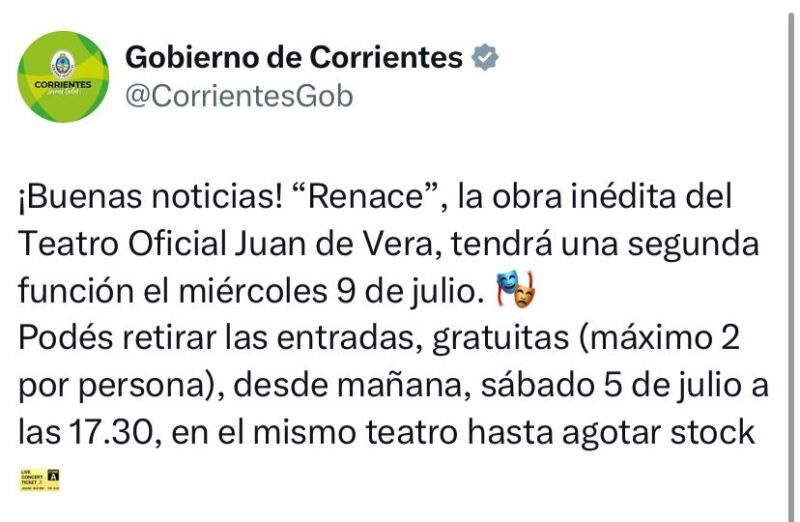 A través de las redes sociales del Gobierno provincial, se anunció que la obra tendrá una segunda función gratuita el próximo miércoles 9. Las entradas podrán ser retiradas de a dos por persona hoy desde las 17:30 en las escalinatas del coliseo correntino hasta agotar stock.