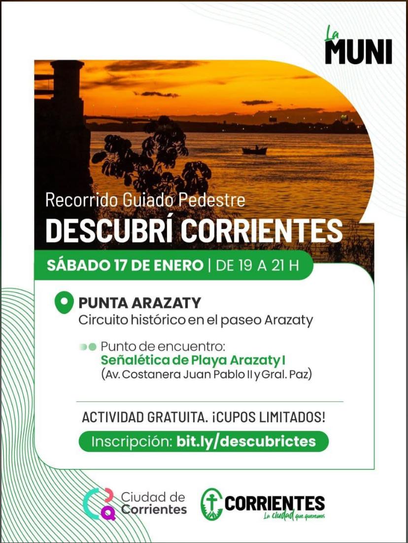 El recorrido tendrá lugar el sábado 17 de enero, en el horario de 19 a 21 horas, y se desarrollará en Punta Arazaty, uno de los puntos más representativos de la costanera. El circuito propuesto es de carácter histórico y se realizará a lo largo del paseo Arazaty, combinando relatos, referencias culturales y el paisaje natural del río Paraná.
