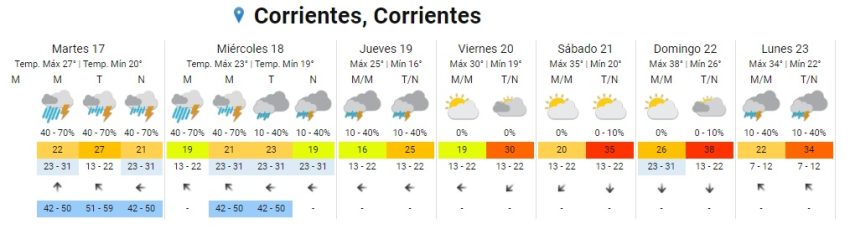 La temperatura máxima esperada para hoy es de 27° C en la Capital correntina que descenderá en los días siguientes. Para el fin de semana, tras las lluvias, podría repuntar para alcanzar un pico de calor de 38° C durante el domingo.