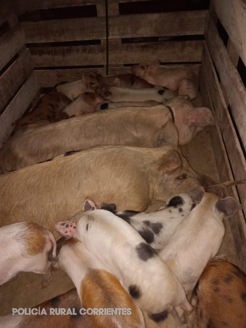 Según informaron, el personal policial detuvo la marcha de un camión Ford F-350, el cual era conducido por un hombre de 34 años. Al inspeccionar el vehículo, se constató que en un carretón de madera eran transportados una chancha y 17 lechones.