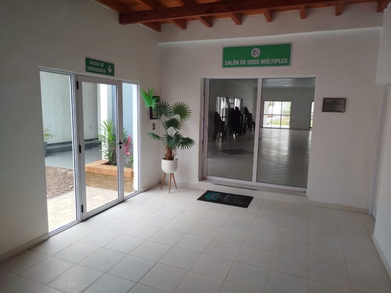 e incluye un Salón de Usos Múltiples (SUM) destinado a ser utilizado por las instituciones, organizaciones, asociaciones y clubes de la comunidad. El diseño incorpora baños completos, incluyendo instalaciones específicas para personas con discapacidad (hombres y mujeres). Además, dispone de cocina, recepciones (frontal y lateral), salas de descanso en ambas plantas y un patio equipado con quincho, parrilla, baños y depósito.