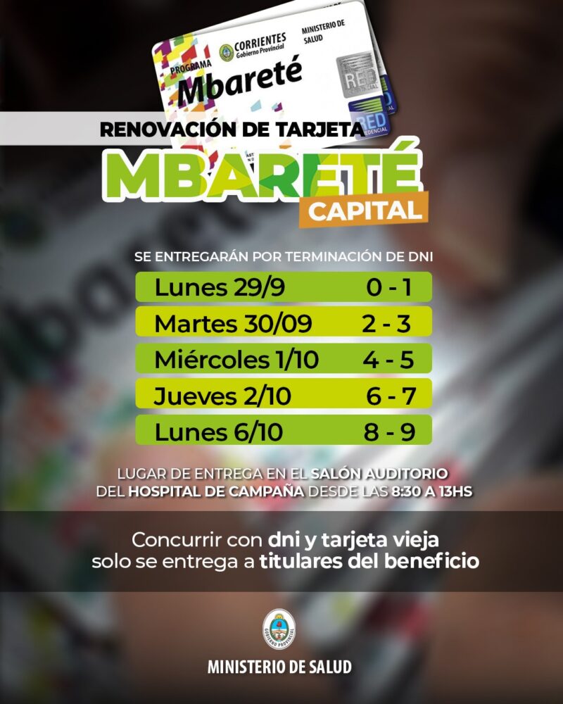 El Ministerio de Salud Pública a cargo del doctor Ricardo Cardozo, informó que se actualizaron los plásticos del programa Mbareté. Por ello, es necesario que los beneficiarios se acerquen el día, lugar y horario que se indica en el cronograma.