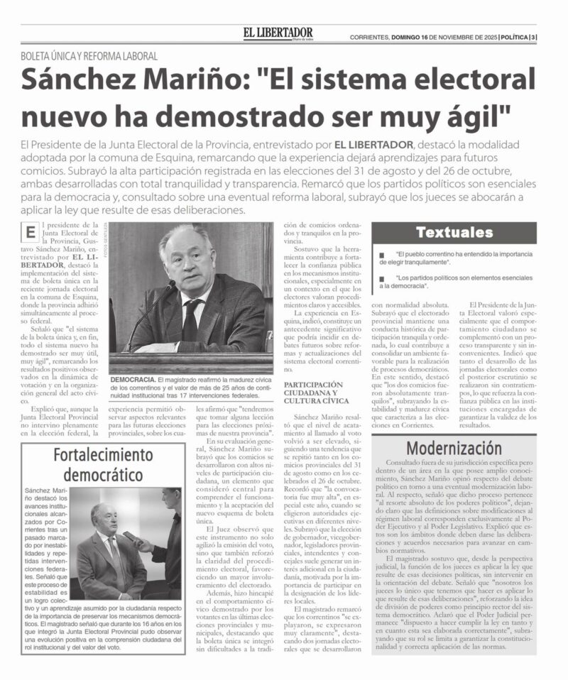 El presidente de la Junta Electoral de la Provincia, Gustavo Sánchez Mariño, entrevistado por EL LIBERTADOR, destacó la implementación del sistema de boleta única en la reciente jornada electoral en la comuna de Esquina, donde la provincia adhirió simultáneamente al proceso federal.