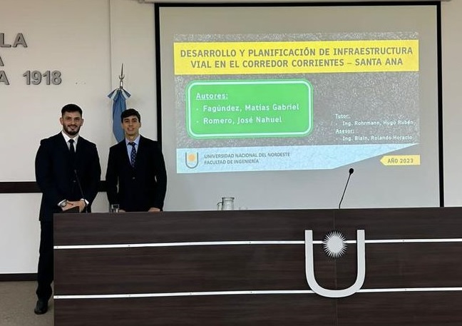 «Desarrollo y Planificación de Infraestructura Vial en el Corredor Corrientes- Santa Ana» se denomina el trabajo con el cual Matías Gabriel Fagúndez y José Nahuel Romero lograron alcanzar el título profesional en la carrera la alta casa de estudios del NEA.