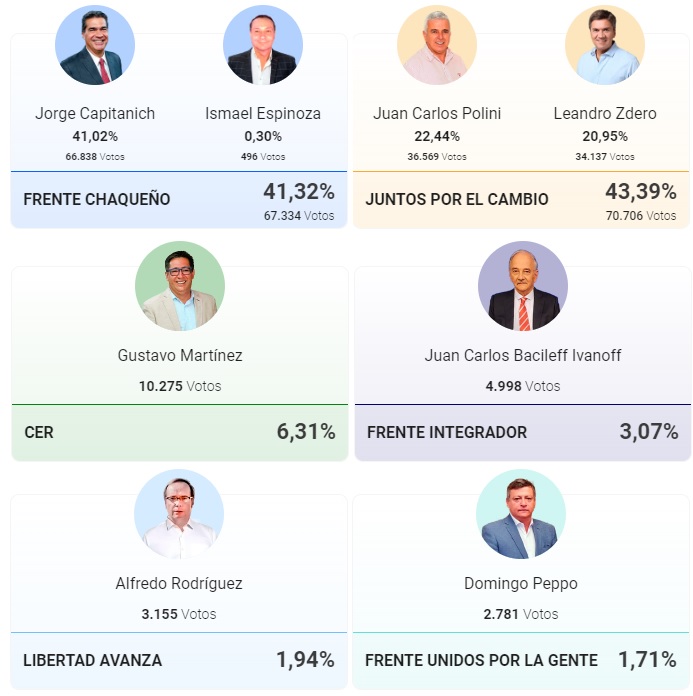 El mandatario se imponía como el candidato del Frente Chaqueño, con votos a su favor sobre Ismael Espinoza por amplísimo margen y el más votado de la provincia hasta ese momento, mientras que en Juntos por el Cambio Juan Carlos Polini quedaba por detrás de Leandro Zdero en conteo reñido, y Gustavo Martínez, precandidato de CER, con 6,12 por ciento.