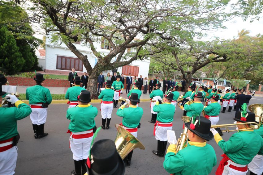 Se inició la jornada festiva con el tradicional toque de Diana de Gloria interpretado por la Banda de Música de la Policía de Corrientes, vistiendo el uniforme de los Cazadores Correntinos, frente a la residencia oficial del gobernador, Gustavo Valdés, en la costanera General San Martín, con el majestuoso río Paraná como telón de fondo.