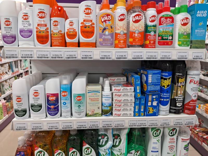 «Todavía por el momento está un poco quieto. En cuanto a precios, la marca off en aerosol está a 5.870 pesos; en crema 4.150 pesos y una marca alternativa livopen sale 4.570 pesos. La línea infantil, la marca off defensa está 14.000 pesos la crema», explicó.