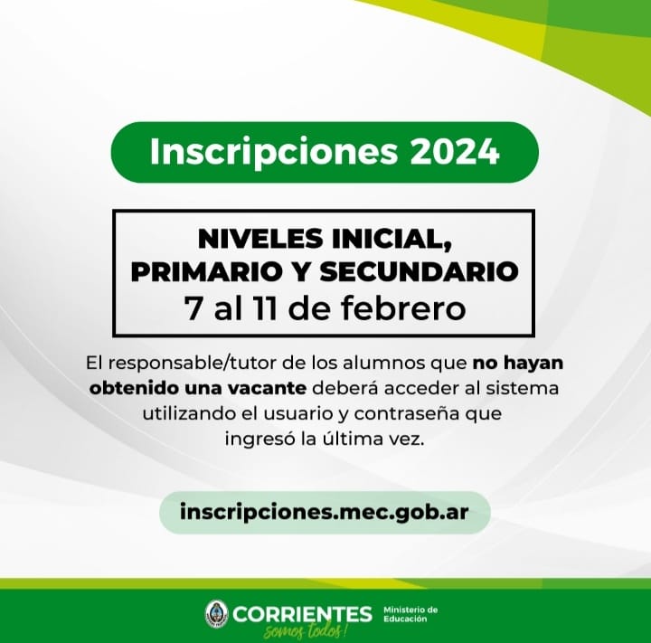 El responsable/tutor de los alumnos que no hayan obtenido una vacante deberá acceder al sistema a través del link inscripciones.mec.gob.ar con usuario y contraseña utilizados la última vez.