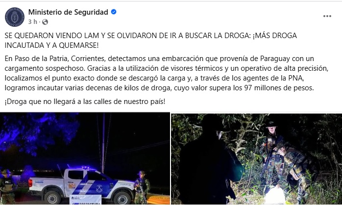 En la página del Ministerio de Seguridad de la Nación dieron a conocer el resultado de un operativo en la costa de la localidad correntina de Paso de la Patria. Se trató de un secuestro de drogas valuada en casi cien millones de pesos, pero lo llamativo fue la manera en que hicieron referencia al trabajo realizado.