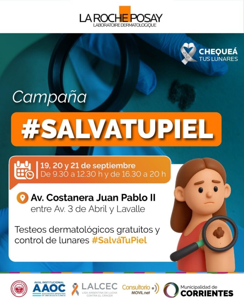 En el marco de la 13ª campaña “Salvá tu piel”, la Municipalidad de Corrientes y la firma La Roche-Posay realizarán este viernes, sábado y domingo testeos dermatológicos gratuitos en la Costanera. Las atenciones se brindarán por orden de llegada, de 9 a 12.30 y de 16.30 a 20.