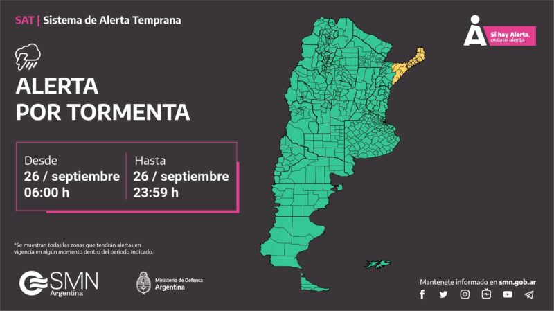 El Servicio Meteorológico Nacional renovó la alerta amarilla por tormentas fuertes para el noreste del territorio provincial, este jueves 26.