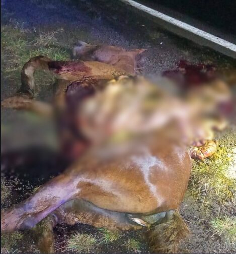 La noche de ayer pudo haber terminado en tragedia para una familia que viajaba por la Ruta Nacional N°14, cuando un caballo suelto se cruzó en su camino, provocando un inesperado siniestro vial. El incidente solo dejó daños materiales y lesiones leves para la persona involucrada. El animal, en tanto, murió en el lugar a causa de la brutal colisión.