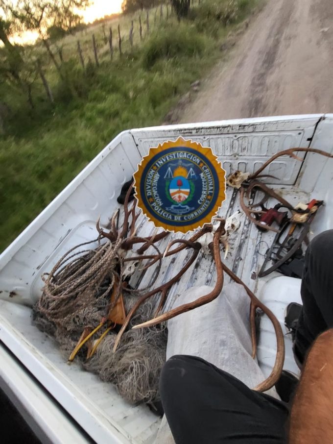 Durante los allanamientos en distintas viviendas, los agentes incautaron numerosos objetos vinculados con la actividad furtiva. Entre los elementos secuestrados se encontraban cabezas de ciervo con astas, lazos, cueras para cortar carne, balanza digital, radios handy y una red de pesca.