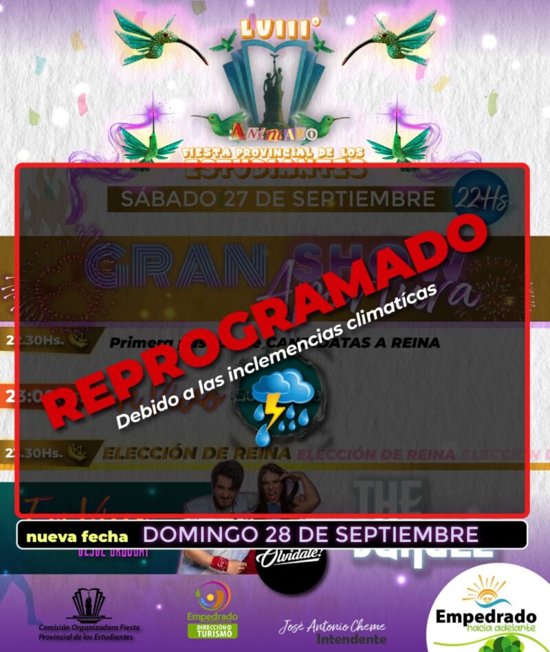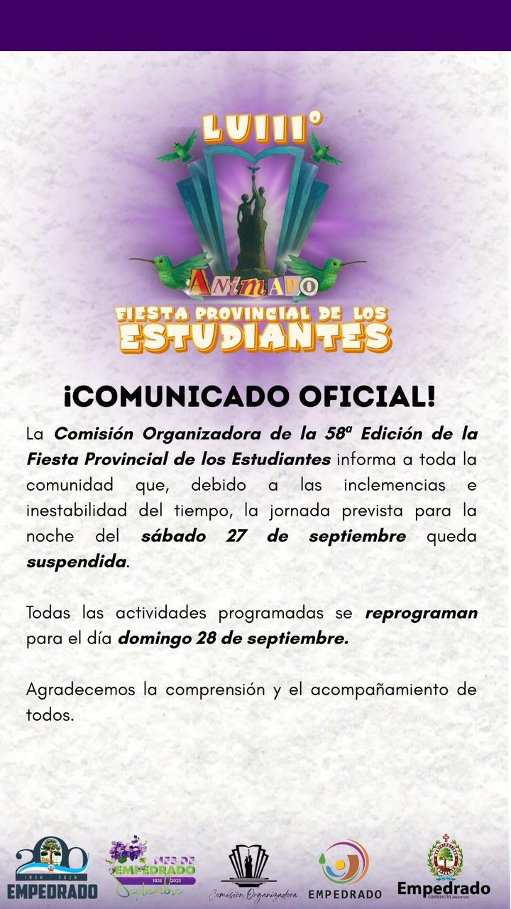 La Comisión Organizadora de la 58º edición de la Fiesta Provincial de los Estudiantes anunció la suspensión de las actividades de éste sábado 27, por las inclemencias del tiempo.