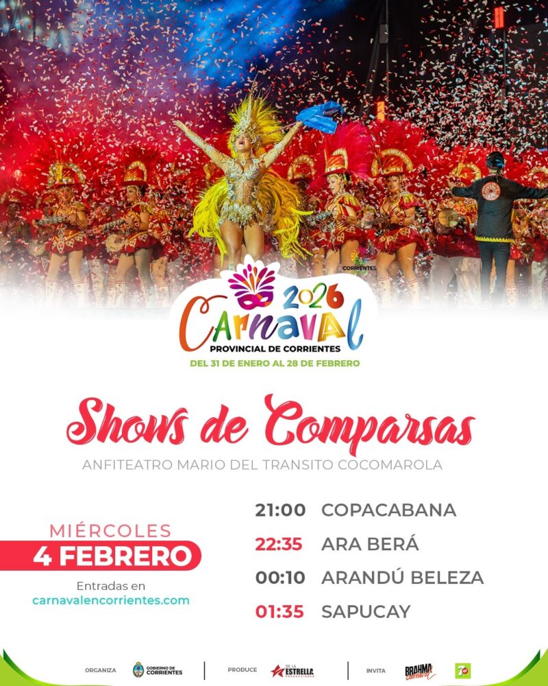 La magia del Carnaval de Corrientes se traslada de la calzada del corsódromo al escenario teatral. Mañana, miércoles 4 de febrero, el Anfiteatro Mario del Tránsito Cocomarola abrirá sus puertas para la primera de las tres noches de Shows de Comparsas, una de las propuestas más esperadas por el público que busca disfrutar de la narrativa, la danza y el despliegue escénico de las grandes agrupaciones.
