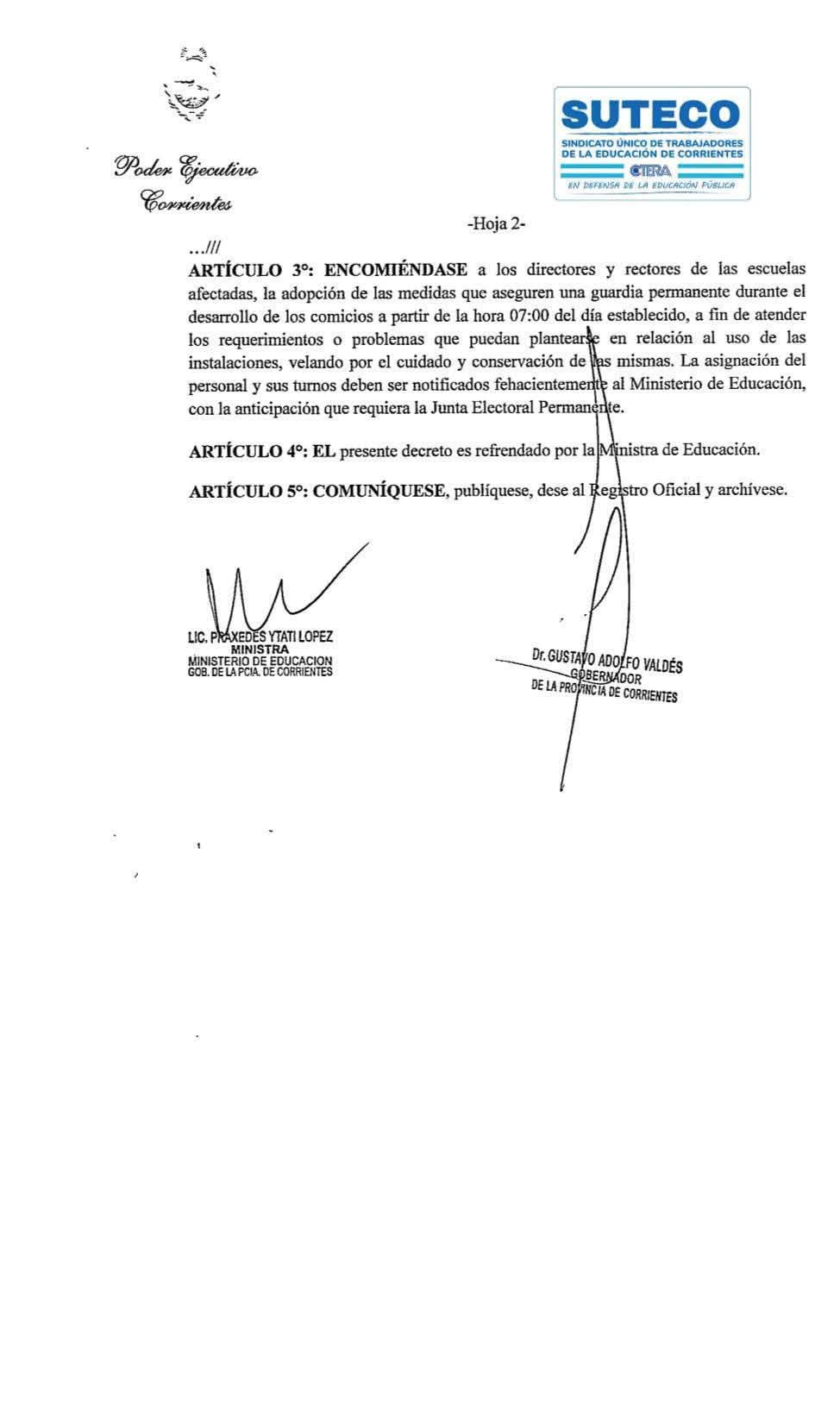 Entre las consideraciones se establece: “Que es necesario disponer el cese de las actividades en los establecimientos escolares afectados para los comicios, de acuerdo con la Resolución N 3.860/2025 del Ministerio de Educación, aprobada por Decreto N° 1.962/2025, desde el 24 al 27 de octubre de 2025, afectando a todo su personal para realizar las tareas de preparación de cuartos oscuros, limpieza y ordenamiento de los locales, conforme con los instructivos suministrados por la Junta Electoral”.