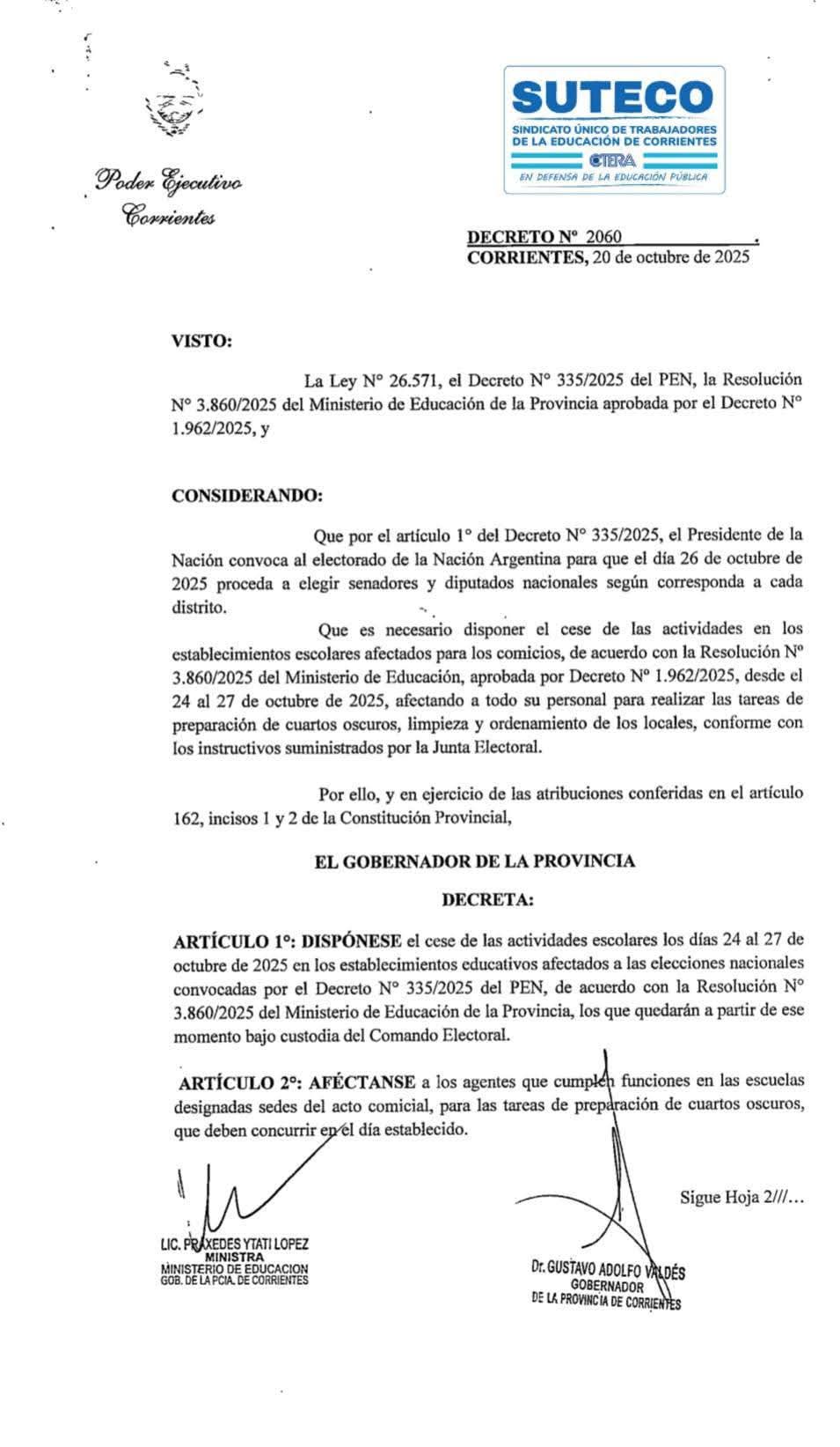 El Ejecutivo emitió el decreto N° 2060, basado Ley N° 26.571, el Decreto N° 335/2025 del PEN, la Resolución Nº 3.860/2025 del Ministerio de Educación de la Provincia aprobada por el Decreto N° 1.962/2025.