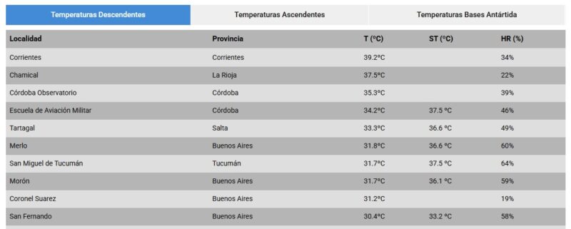 Las otras ciudades que acompañaron en el podio son Chamical (La Rioja) con 37.5°C, y Córdoba Observatorio (Córdoba) con 35.3°C.