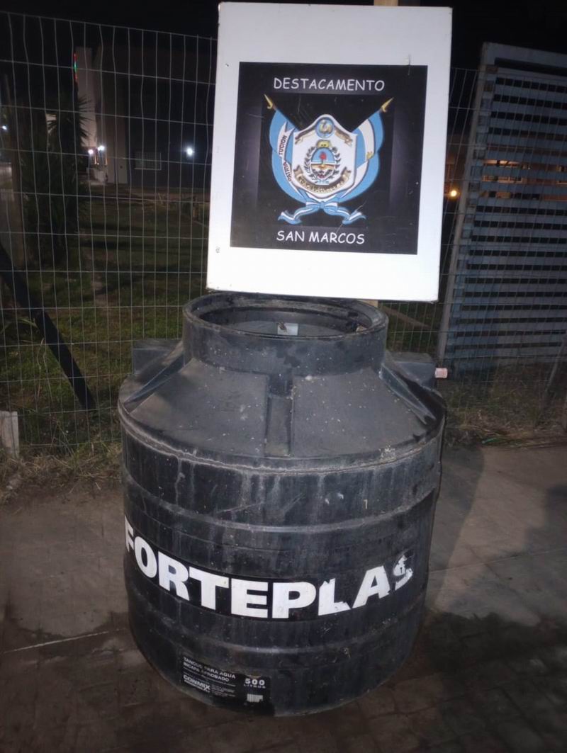 Fue en ese contexto que integrantes del Destacamento San Marcos fueron alertados por el sistema integral de seguridad 911, acerca de dos individuos que transitaban con el tanque. En ese contexto, los uniformados iniciaron las averiguaciones correspondientes y constataron que se trató del robo a un domicilio de la zona.