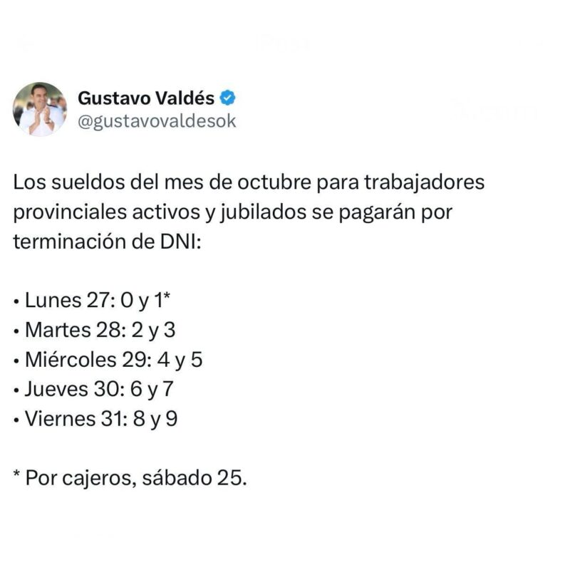 A través de sus redes sociales, @gustavovaldesok, comunicó el pago del sueldo de octubre a los agentes de la administración pública provincial, activos, jubilados y pensionados. El cronograma se extiende entre este lunes 27 y el viernes 31.