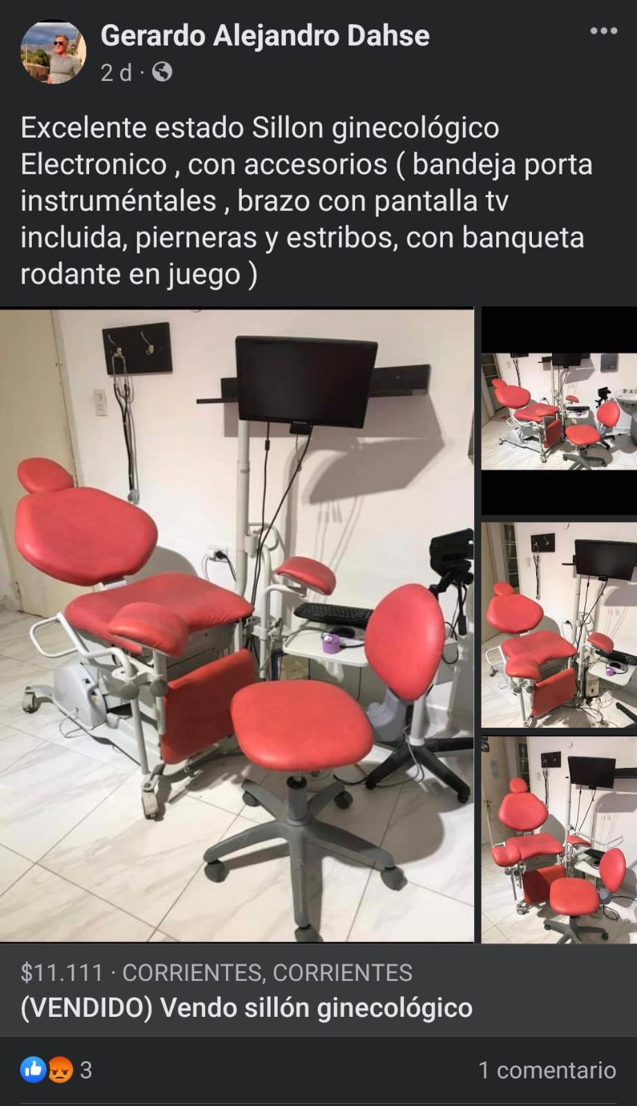 El médico condenado por abuso sexual, Gerardo Dahse puso a la venta en Facebook un sillón ginecológico que presuntamente pertenecía a su consultorio, donde ya no puede ejercer tras ser inhabilitado por haber sido encontrado culpable de atacar a al menos una de sus pacientes, aunque hay otras denuncias en su contra.