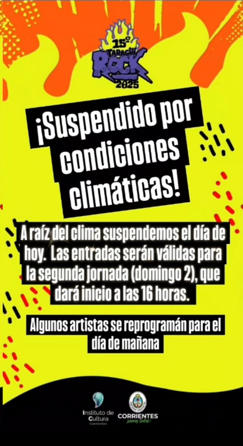 El Instituto de Cultura informó la suspensión de la primera jornada del Taragüí Rock 2025, programada para este sábado 1 de noviembre en el anfiteatro Mario del Tránsito Cocomarola.