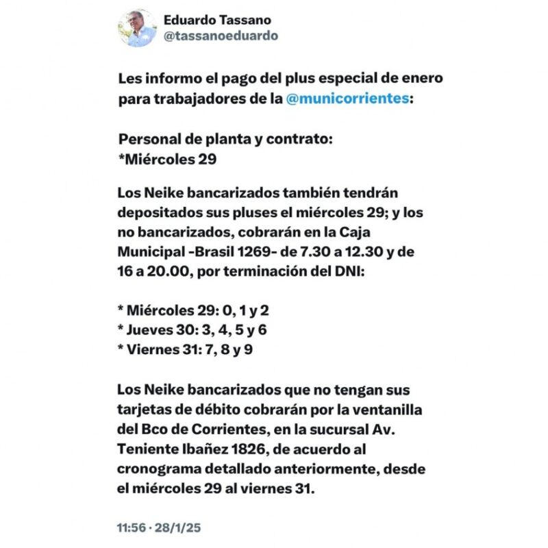 A través de sus redes sociales, el intendente Eduardo Tassano confirmó las fechas de pago del plus especial para los trabajadores municipales.