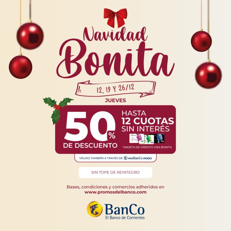 Finalmente, se incorpora una promoción especial con la tarjeta de crédito Visa Bonita del BanCo, “Navidad Bonita”, que ofrecerá un 50 por ciento de descuento sin tope de reintegro, en hasta 12 cuotas sin interés, los días jueves 12, 19 y 26 de diciembre, en todos los comercios adheridos a la promo habitual los días jueves. Son más de mil comercios los que se encuentran adheridos a este beneficio.