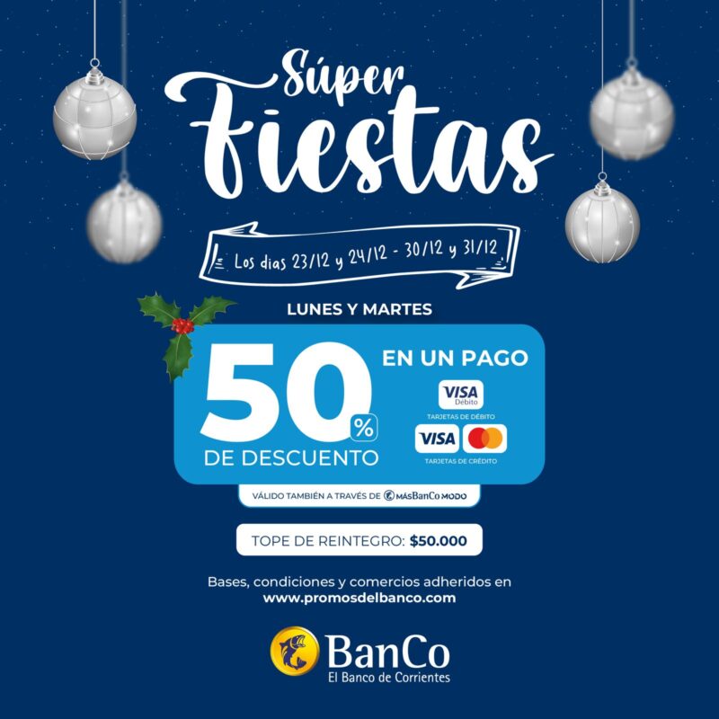 Supermercados, carnicerías, bodegas y comercios afines adheridos contarán con la promoción “Super Fiestas”, donde se ofrecerá un 50 por ciento de descuento, con tope de reintegro de 50.000 pesos por vigencia y por cuenta. La misma alcanza a las compras que se realicen los días 23 y 24, 30 y 31 de diciembre, en los más de 230 locales adheridos, abonando en un pago con tarjetas de débito y de crédito Visa y Mastercard del Banco de Corrientes.