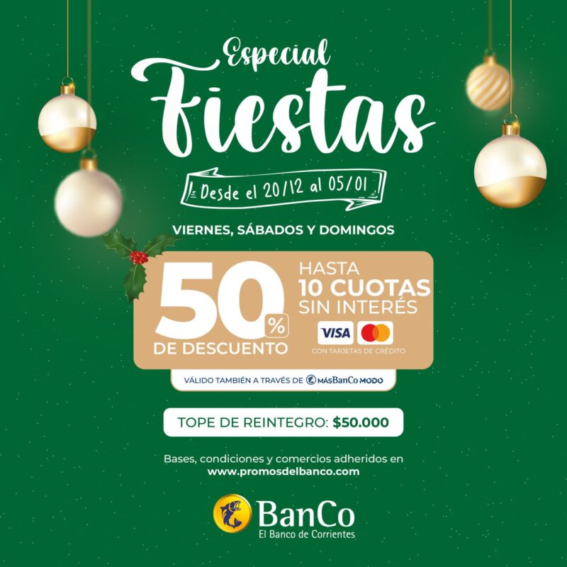 Con más de 600 comercios adheridos, la promo “Especial Fiestas” abarcará los rubros indumentaria, ópticas, zapaterías, marroquinerías, perfumerías, librerías, estéticas, jugueterías, bicicleterías, artículos de decoración, bazares, entre otros. Estará vigente los días viernes, sábados y domingos, desde el 20 hasta el 5 de enero inclusive. El beneficio será del 50 por ciento de reintegro, con tope de 50.000 pesos, para compras en hasta 10 cuotas sin interés con todas las tarjetas de crédito Visa y Mastercard del Banco de Corrientes.