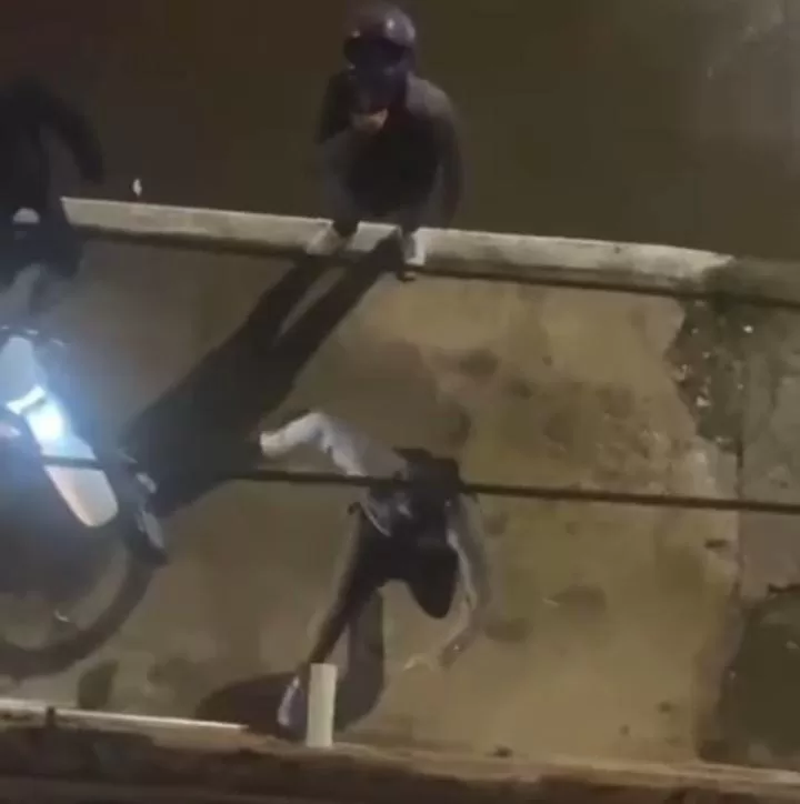 Una persona se asoma desde el interior del inmueble por la ventana para pedir ayuda a los vecinos. “Ayuda, ayuda, podés llamar a la policía por favor, están queriendo entrar a mi casa…”, gritó lo que alertó a vecinos de otro edificio. Ante la presencia de espectadores, los motociclistas entonces decidieron retirarse del lugar.