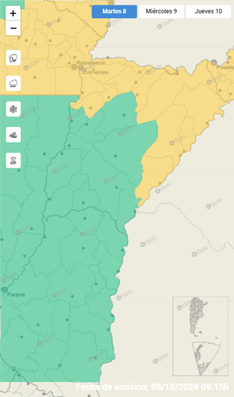 De acuerdo al Servicio Meteorológico Nacional, continúa la alerta amarilla por lluvias y tormentas para la capital provincial para el resto de hoy y de mañana. Según el informe del organismo, el área “será afectada por tormentas de variada intensidad, algunas localmente fuertes. Se espera que las mismas estén acompañadas principalmente por abundante caída de agua en cortos períodos. También pueden estar presentar intensa actividad eléctrica, ocasional caída de granizo y fuertes ráfagas”.
