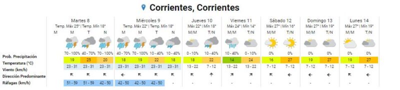 Por otro lado, el pronóstico indica que las probabilidades de lluvias y precipitaciones se mantienen hasta el viernes. Además, se esperan ráfagas de entre 40 y 60 km/h.