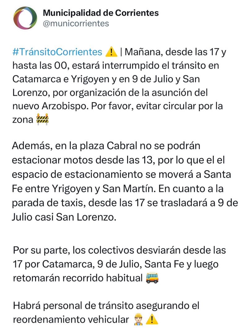 Se espera una convocatoria multitudinaria y por ello se desplegará un fuerte operativo de tránsito: desde las 17 y hasta las 00, estará interrumpido el tránsito en Catamarca e Yrigoyen y en 9 de Julio y San Lorenzo, por organización de la asunción del nuevo Arzobispo. Por favor, evitar circular por la zona.