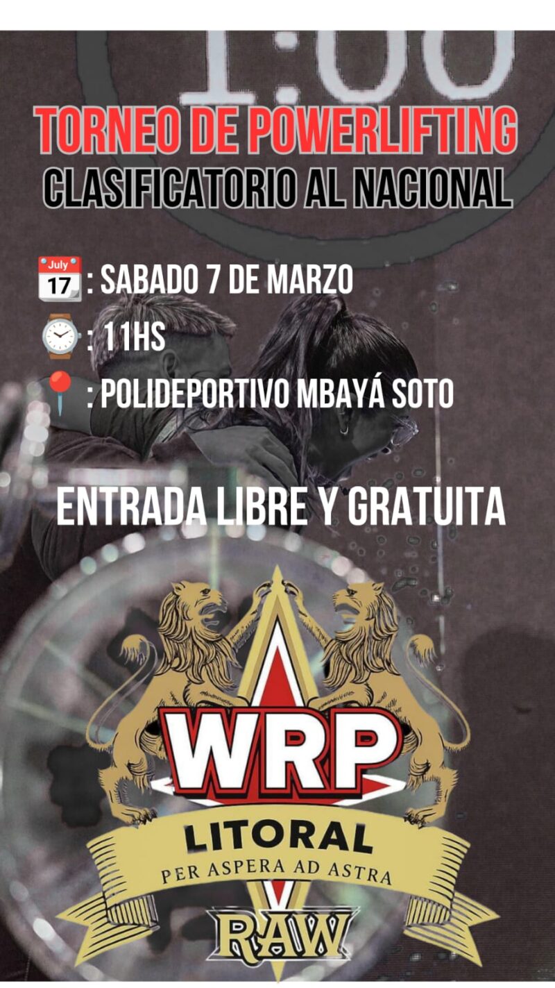 Este sábado 7 de marzo, desde las 11, se realizará en el Polideportivo Mbayá Soto de San Luis del Palmar un torneo de powerlifting clasificatorio al nacional, organizado por WRPF Litoral. El evento contará con entrada libre y gratuita, por lo que el público podrá acercarse a presenciar una disciplina que combina fuerza máxima, técnica y preparación física.