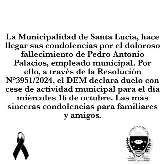 “La Municipalidad de Santa Lucía hace llegar sus condolencias por el doloroso fallecimiento de Pedro Antonio Palacios, empleado municipal. Por ello, a través de la Resolución Nº 3951/2024, el DEM declara duelo con cese de actividad municipal para el día miércoles 16 de octubre. Las más sinceras condolencias para familiares y amigos”, dice el comunicado.