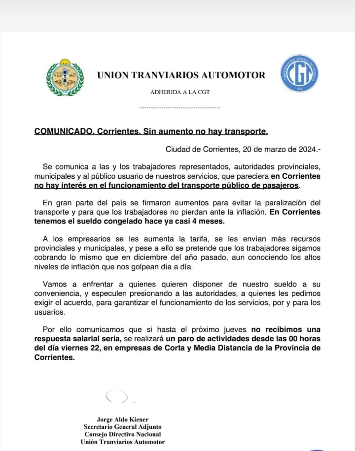 El gremio que nuclea a los trabajadores del volante emitió un comunicado en el que advierten que – en caso de no hallar respuestas el día jueves – avanzarán con un paro de actividades desde las 00: 00 del viernes 22. En tanto, el empresariado nucleado en la Fatap aseveró que a escala nacional está dispuesto un cuarto intermedio hasta el próximo lunes 25. «En gran parte del país se han dispuesto aumentos para evitar la paralización del transporte, sin embargo en Corrientes nuestros salarios están congelados hace 4 meses» puntualizaron en un comunicado institucional.